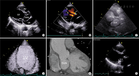 因主动脉窦瘤的部位和破入的心腔不同,表现差别较大,且常合并其他畸形,易出现漏诊、误诊,需与以下几种心血管病相鉴别:①二尖瓣血性囊肿:二尖瓣血性囊肿为瓣膜上附着的囊状肿物,形态较规则,其内为无回声区,可随瓣膜运动,与主动脉窦不相通,左心超声造影检查可见囊肿内无造影剂回声充盈[7]。②室间隔膜部瘤:室间隔膜部局限性向右心室膨出,呈"乳头状"改变;分流多为收缩期的湍流[8],室间隔膜部瘤易与右冠窦窦瘤破裂相混淆[9]。③室间隔缺损合并主动脉瓣脱垂:漏斗部室间隔缺损常合并右冠瓣脱垂,于收缩期及舒张期均出现异常高速血流信号,极易与右冠窦窦瘤破裂混淆,多普勒血流信号虽为双期,但为非连续性。④Valsalva窦假性动脉瘤:Valsalva窦假性动脉瘤多为创伤所致,有外伤史[10];假性动脉瘤内血流信号不丰富,不见其与心腔的交通。⑤冠状动脉瘘:冠状动脉瘘时冠状动脉多扩张,为主动脉瓣环水平以上的异常扩张结构,且为双期连续性分流信号,但冠状动脉瘘的冠状动脉增宽呈管状,走行迂曲,无囊袋样结构,可追踪显示扩张的冠状动脉直至瘘口[11]。⑥马凡综合征:马凡综合征是一种常染色体显性遗传的结缔组织疾病,主要侵犯眼部、肌肉骨骼和心血管系统[12],其主动脉病变常于幼年起始于主动脉窦部,约70%~80%的患者可表现为主动脉窦部扩张[13]。先天性主动脉窦瘤常为主动脉窦的孤立性一窦局限性向外膨出,范围较小,不伴马凡综合征的特异性骨骼及眼部改变,可作为二者鉴别点。