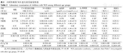 注:NCS:胡桃夹综合征;-:行Fisher′s检验或无法计算P值;与其他各年龄组比较,aP<0.05;与同年龄段的血尿+蛋白尿组、孤立性蛋白尿组比较,bP<0.05;与同年龄段的孤立性血尿、孤立性蛋白尿组比较,cP<0.05 NCS:nutcracker syndrome;-:indicatesFisher′s test or unable to calculate P value,compared with other age groups,aP<0.05;compared with the same age group of hematuria albuminuria group and solitary proteinuria group,bP<0.05;compared with isolated hematuria and isolated proteinuria of the same age group,cP<0.05