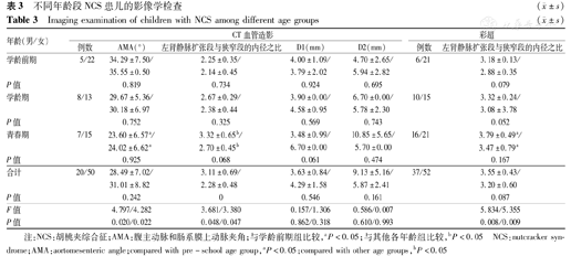 行CTA检查的NCS患儿中,青春期组的AMA明显小于学龄前期组(P男=0.020,P女=0.022),其a/b值亦明显大于学龄期前期组(P男=0.048,P女=0.047),而各年龄段的D1及D2值差异则无统计学意义(P>0.05)。行彩超的NCS患儿中,青春期组的a/b′比值明显高于其他2组(P男=0.008,P女=0.009)。各年龄段男女之间在AMA、a/b、a/b′、D1、D2中差异均无统计学意义(均P>0.05),见表3。
