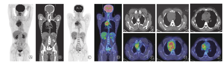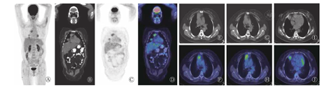 胸腺瘤又称胸腺上皮瘤,是含有不同比例的胸腺上皮细胞和淋巴细胞的实质性肿块。胸腺瘤多发生于40岁以上患者,20岁以下患者较少见[2]。良性胸腺瘤密度一般较均匀,而恶性胸腺瘤易坏死囊变,低密度常为多发,面积较大。钙化是胸腺瘤一个较为特异性的征象,多为斑点、裂隙样或条状钙化。恶性胸腺瘤分为侵袭性胸腺瘤和胸腺癌,常见的18F-FDG PET/CT表现如下:①肿瘤呈分叶状,边界不清,可出现囊变坏死;②18F-FDG摄取常不均匀,侵袭性胸腺瘤恶性度低于胸腺癌,其18F-FDG摄取低于胸腺癌;③淋巴结转移时可表现为纵隔及肺门淋巴结肿大,18F-FDG摄取增高;④肺转移时表现为肺内类圆形小结节,密度较低,结节较小时18F-FDG摄取不增高;⑤胸膜种植时可见胸膜不规则增厚或结节状影,18F-FDG摄取增高,多合并血性胸腔积液[3,4]。