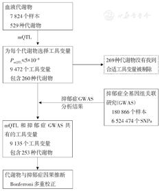 mQTL汇总数据来源于Shin等[16]在2014年Nature Genetics上发表的关于人类血液代谢产物的研究(http://metabolomics.helmholtz-muenchen.de/gwas/),其中529种代谢物满足P<1×10-5。抑郁症GWAS汇总数据来源于180 866名人群Meta分析的结果[29](https://www.thessgac.org/data),整合了精神病学基因组学联盟(Psychiatric Genomics Consortium,PGC)、英国生物数据库(UK Biobank,UKB)以及老年遗传流行病学研究(Genetic Epidemiology Research on Aging,GERA)的关联分析结果。