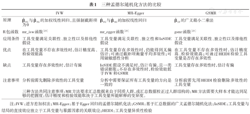 注:IVW:逆方差加权法;MR-Egger:基于Egger回归的孟德尔随机化法;GSMR:基于汇总数据的广义孟德尔随机化法;InSIDE:工具变量与结局的直接效应独立于工具变量与暴露因素的关联效应;HEIDI:工具变量异质性检验