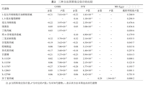 注:β为因果效应估计值;P为对应的P值;a为未知代谢物;-:表示该方法未筛选出该代谢物