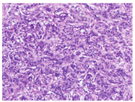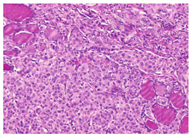 转移性甲状腺癌临床表现无明显特征性,肿瘤较小时,无明显临床症状、不易察觉,仅仅依靠体格检查、实验室、影像学资料很难早期做出诊断,待其出现明显临床症状时,转移灶往往已较大,患者多以短期内甲状腺体积迅速增大,伴或不伴声音嘶哑及呼吸、吞咽困难为主要就诊原因;肿瘤侵犯神经可出现声音嘶哑、饮水呛咳,侵犯气管、食管会出现相应的梗阻症状。通过超声、核素扫描、细针穿刺活检等有助于诊断。乳腺癌患者发现甲状腺结节,活检组织免疫组化检测到甲状腺转录因子1和甲状腺球蛋白阳性,应考虑原发性甲状腺癌;检测到雌激素受体和孕激素受体阳性,应考虑转移性甲状腺癌。本例由于术前未行穿刺活检,体格检查、彩超、核素显像、CT检查等也未能发现乳腺癌甲状腺转移特征,考虑到患者有乳腺癌病史,甲状腺结节生长较快且已出现压迫症状,我们果断直接手术切除,解除了压迫。通过免疫组化检测ER(+)、PR(+)、TTF-1(-)、Tg(-),对乳腺癌甲状腺转移的诊断具有指导作用。另外,乳腺癌甲状腺转移还应与结节性甲状腺肿、桥本氏甲状腺炎、原发性甲状腺透明细胞癌等疾病鉴别[13]。