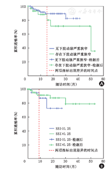 注:图A:是否存在下肢动脉严重狭窄对术后再狭窄发生率的影响;图B:术中反流压与患者基础收缩压的比值(SSI)是否大于0.25对术后再狭窄发生率的影响