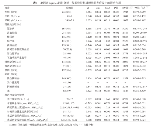 | 对侧颈动脉重度狭窄[例(%)] | 51(17.3) | 0.448 | 0.832 | 0.290 | 0.590 | 1.565 | 0.307~7.984 | |