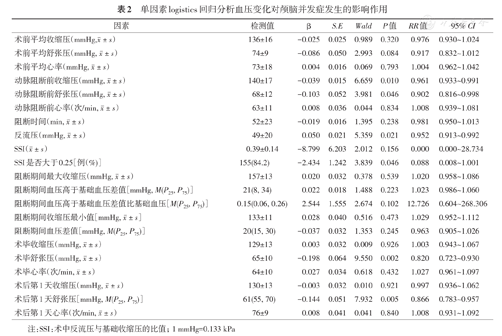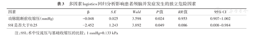 动脉阻断前收缩压、SSI是否大于0.25是导致患者不良预后的独立影响因素(表3)。