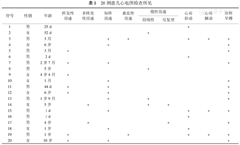 20例患儿中,男13例,女7例。有8例在胎儿期就发现有心率增快伴不齐。患儿年龄≤3个月者多无明显症状,仅有2例患儿出现心源性休克征象;3~10岁患儿7例中有2例曾出现呕吐、面色苍白、出汗、乏力或胸闷、心悸等症状。常规心电图及24 h动态心电图显示阵发性房性心动过速7例、慢性房性心动过速5例、紊乱性房性心动过速2例、非阵发性房性心动过速2例、频发房性期前收缩伴反复短阵房性心动过速10例、单纯心房扑动2例、3例可见混有心房颤动。20例患儿经心脏超声、X线胸片、心肌酶谱、肌钙蛋白等检测均未发现有器质性心脏病征象。20例患儿均采用地高辛、普萘洛尔联合治疗方案,多在治疗1周后控制快速心率、甚至转为窦性心律。学龄前儿童对抗心律失常药物敏感性较差,疗程相对较长。2例患儿并发快速心律失常性心肌病。