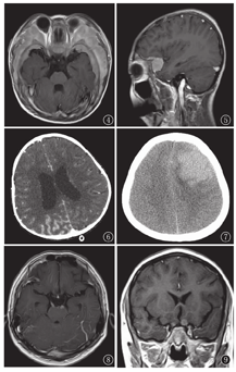 共23例,包括硬脑膜、软脑膜、脑实质、颅骨和颅神经的浸润,部分病例兼有2种或2种以上浸润形式。23例中硬膜伴和/或伴颅骨浸润18例,表现为硬膜和/或颅骨梭形或结节、肿块样增厚,颅骨以颅底骨受累显著,可跨颅板(图4)。病灶在CT上呈较高密度,T1WI低信号,T2WI中等信号,增强检查明显强化(图5);软脑膜浸润6例,表现为软脑膜广泛或局限性增厚、强化(图6);脑实质浸润2例,CT表现为高密度肿块(图7),MRI T1WI低信号、T2WI中等信号肿块伴周围脑实质水肿;颅神经浸润3例,MRI表现为2例动眼神经(1例单侧,1例双侧,图8)、1例双侧视神经增粗强化(图9)。