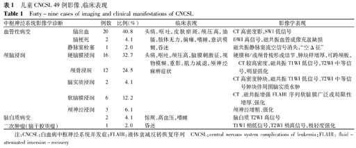 白血病是儿童最常见的恶性肿瘤,约占儿童所有恶性肿瘤的30%。随着治疗方法的不断改进,白血病成为目前疗效最好、治愈率最高的恶性肿瘤之一[1],生存期延长的同时白血病中枢神经系统并发症(CNSCL)增加[2],CT和磁共振成像(MRI)的应用对其诊断、治疗有重要意义。国内关于CNSCL影像研究多集中在成人,儿科领域尚缺乏较系统的影像资料。本研究回顾性分析经病理、脑脊液(CSF)及临床证实的49例儿童CNSCL的影像表现及临床资料(不包括脊髓受累病例),旨在分析儿童CNSCL的影像表现,并探讨其临床联系。