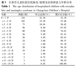 The age distribution of hospitalized children with encephalitis and meningitis syndrome in Changchun Children′s Hospital