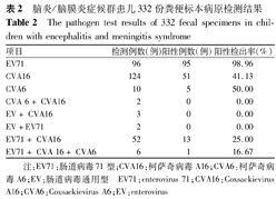检测粪便标本332份,患儿多为手足口病并脑炎,EV71阳性检出率为98.96%,其次为CVA6,检出率为41.16%。结果见表2。