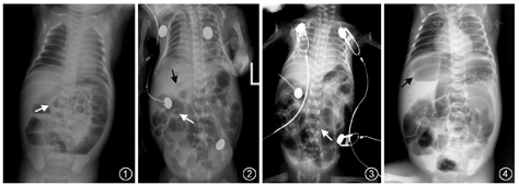坏死性小肠结肠炎是常见的新生儿外科急症,近年发病率呈上升趋势。本病病因不明,起病急,病死率高,是儿童早期死亡的重要原因。腹部X线平片是首选影像检查方法,由于病情进展快,及时复查、动态观察对评估病情非常重要。主要X线征象为肠管充气减少或不均匀,病变肠管形态僵直和肠间隙增厚伴积气,门静脉积气为特征性改变,其他可合并腹腔积液及气腹。超声及增强CT可辅助评估肠壁血运情况。