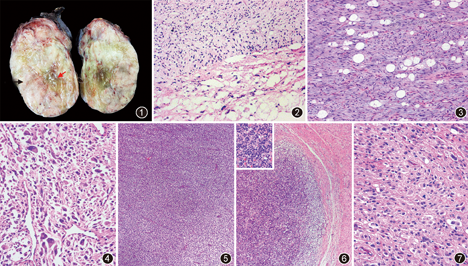 如前所述,DDLPS组织学上通常表现为ALT/WDLPS成分向非脂肪源性的肿瘤成分转化,2种成分在镜下通常分界较清楚,表现为突然的过渡(图2);但有时可表现为逐渐的过渡或在整个肿瘤内交错的分布(马赛克样的去分化),这一情况尤其在伴有低级别去分化时常见(图3)[2,6]。肿瘤可能部分带假包膜或边界清楚,但至少局部可见推挤状或浸润性边界,后腹膜的DDLPS常见累及周围实质器官(如肾脏等)。高分化与去分化成分的比例在不同肿瘤内多少不等,有时候即使在广泛取材的情况下高分化成分也可能完全缺如,而去分化成分通常较广泛,但有时也可能仅仅不足1 cm(又称为微小去分化)[6]。DDLPS中的ALT/WDLPS组织学类型以脂肪瘤样和硬化性为主[2,6,10],而去分化成分大多数表现为高级别去分化特征包括高级别多形性肉瘤样(多形性瘤细胞伴有席纹状排列类似于多形性未分化肉瘤/恶性纤维组织细胞瘤,图4)、高级别梭形细胞肉瘤样(细胞密度较高的梭形瘤细胞伴有交错束状或鱼骨样排列类似于纤维肉瘤,图5)以及少见的高级别圆细胞肉瘤样(弥漫的小蓝圆细胞类似于骨外尤文肉瘤或差分化的滑膜肉瘤,图6)和上皮样特征(弥漫成片的上皮样瘤细胞伴有丰富的嗜酸性胞质或横纹肌样特征类似于转移性癌或恶性间皮瘤,图7)[11],高级别去分化成分通常瘤细胞密度高,间质稀少,核分裂象活跃(>5个/10 HPF),但比较于与之类似的肿瘤而言,去分化成分的核分裂象相对较少[4];坏死较为常见。