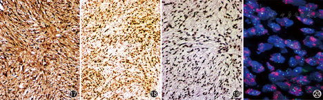免疫组织化学染色,绝大多数的DDLPS弥漫强表达p16蛋白(核和质表达,图17),是诊断DDLPS最敏感的标志物[18],但缺乏特异性,许多与之形态学相似的肿瘤,特别是高级别肿瘤(如平滑肌肉瘤和肉瘤样癌等)亦可弥漫表达p16[19]。由于DDLPS一致性的存在12q14-15区域的扩增和过表达,而MDM2蛋白和CDK4蛋白的强表达与相应的基因扩增存在高度的一致性,因此免疫组织化学染色MDM2和CDK4的共表达(均为弥漫核表达)对于诊断DDLPS具有较大的帮助(图18,图19)。在与ALT/WDLPS之外的其他类型的脂肪源性肿瘤的鉴别诊断中,联合应用p16、MDM2和CDK4对于诊断DDLPS具有高度的敏感性和特异性,Thway等[18]研究表明93%的DDLPS表达上述3个标志物中的至少2个,72%表达全部3个标志物。但在DDLPS与非脂肪源性的肿瘤鉴别诊断时,上述3个标志物的特异性则明显不够;此时,应用荧光原位杂交(FISH)检测MDM2基因的扩增对于诊断DDLPS(在适当的组织学背景下)具有高度的特异性和敏感性(图16,图20),尤其是在小活检标本、未见典型的ALT/WDLPS成分、低级别去分化和少见特殊类型的DDLPS诊断时更是如此[1,2,3,4,20]。MDM2基因的扩增目前普遍认为是诊断ALT/WDLPS和DDLPS的金标准,需要指出的是,MDM2基因扩增并非ALT/WDLPS和DDLPS所特有,其他常见存在MDM2基因扩增的肿瘤还包括低级别中央型骨肉瘤、骨旁骨肉瘤以及原发的心脏内膜肉瘤等[1,2,3,21]。约半数左右的DDLPS可局灶或弥漫表达CD34[22],去分化成分一般不表达S-100蛋白,伴有肌纤维母细胞分化者可表达平滑肌肌动蛋白(SMA)和肌特异性蛋白(MSA)或结蛋白[23],伴有横纹肌和平滑肌分化者可分别表达Myo D1和H-caldesmon,具有脑膜上皮瘤样漩涡特征的DDLPS可表达SMA和Claudin-1提示其肌纤维母细胞或神经束膜分化的特征[4,13]。新近发现,约6%的DDLPS可见H3k27me3的表达缺失易与恶性外周神经鞘膜瘤(MPNST)混淆[24],约11%的DDLPS可见STAT6基因扩增从而局灶或弥漫表达STAT6易误诊为孤立性纤维性肿瘤(SFT)[25]。