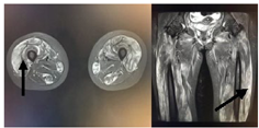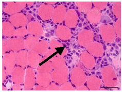 患者,女,20岁,主因"四肢无力9 d,无尿7 d"入院。9 d前无明显诱因出现乏力肌痛,伴随酱油色尿、少尿,当地医院查CK、尿肌红蛋白明显升高,予水化、碱化及透析治疗CK未见明显下降转诊。既往体健,否认用药史。查体:T37.8℃,P120次/min,RR18次/min,Bp147/68 mmHg(1mmHg=0.133Kpa),双侧大腿可见瘀斑,轻度水肿,有压痛,近端肌力4级。双肺呼吸音低,未及啰音,心律齐,腹软,无压痛。辅助检查:血生化ALT1 065 IU/L,AST3 530 IU/L Scr332.7 μmol/L, eGFR16.375 mL/(min·1.73m2),BUN15.27 μmol/L ,CK>8 000 U/L,肌红蛋白>4 140 ng/mL。尿常规:蛋白质+++,红细胞150~180 /HP,WBC100~120/HP。直接抗人球蛋白实验阴性。肌炎抗体阴性。血尿免疫固定电泳未见单克隆免疫球蛋白区带。感染方面筛查:肝炎抗体、CMV/EBV-DNA、呼吸道九种病毒、布氏杆菌、莱姆病、流行性出血热抗体、军团菌皆阴性;高通量病原体检测未检出原核微生物、病毒、真核微生物。重金属筛查阴性。糖化蛋白、甲状腺功能正常。肾脏超声:双肾体积增大且实质回声增强,结构欠清晰。大腿肌肉核磁:双大腿肌肉及双侧下肢肌带肌弥漫水肿,左侧股外侧肌肌筋膜水肿(图1)。入院诊断横纹肌溶解合并急性肾损伤。治疗上,最初间断多次行高通量血液透治疗,血肌酐下降但尿量无明显恢复,且CK水平高居不下。进一步完善的肌肉活检结果(左肱二头肌肌肉)提示:肌纤维坏死、再生,伴随肌束血管周围少量炎细胞浸润,许多肌间毛细血管NSE深染,符合坏死性肌病样病理改变特点(图2)。根据肌肉活检结果考虑免疫介导性坏死性肌病,行激素治疗(甲泼尼龙40 mg/d静点连续10 d后调整为口服泼尼松50 mg口服,静脉激素治疗第3天时曾行甲泼尼龙500 mg静脉冲击1次)及2次血浆置换(每次分别置换3 000 mL)后CK明显下降,尿量也逐渐增多(图3, 图4)。出院时患者口服强的松45 mg/d ,尿量恢复至3 500 mL/d,生化结果:ALT67 U/L,AST26 U/L,Scr99.4 μmol/L,CK78U/L,肌红蛋白23.5 ng/mL,尿肌红蛋白4.6 ng/mL。患者出院1个月后门诊复诊,血肌酐和ck正常,尿量正常,转归良好。