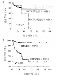A:GATA2突变型与GATA2野生型;B:造血干细胞移植组(HSCT)组与非HSCT组