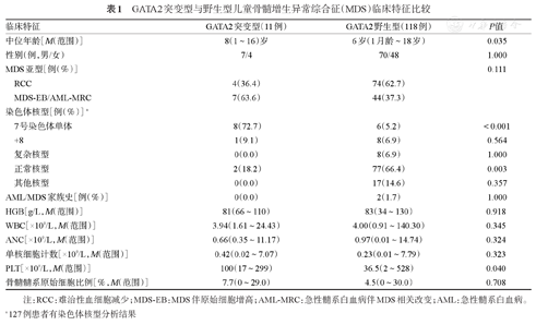 GATA2突变型与野生型儿童骨髓增生异常综合征(MDS)临床特征比较