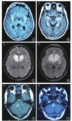 基底节是位于大脑深部中线附近的灰质团块,基底节受累可导致智能减退、意识障碍、运动障碍等。基底节是病毒性脑炎常见的受累部位,以RNA病毒累及比较常见,例如乙型脑炎病毒、黄病毒、肠道病毒。在流行季节发生的基底节脑炎应首先考虑乙型脑炎(图1C和图1D)。2015年之后发现的斑松鼠博尔纳病毒脑炎[9]、嗜神经性星状病毒脑炎等都主要表现为基底节脑炎[10]。