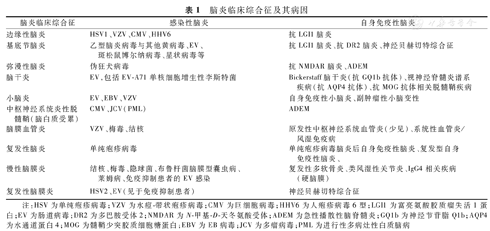 注:HSV为单纯疱疹病毒;VZV为水痘-带状疱疹病毒;CMV为巨细胞病毒;HHV6为人疱疹病毒6型;LGI1为富亮氨酸胶质瘤失活1蛋白;EV为肠道病毒;DR2为多巴胺受体2;NMDAR为N-甲基-D-天冬氨酸受体;ADEM为急性播散性脑脊髓炎;GQ1b为神经节苷脂Q1b;AQP4为水通道蛋白4;MOG为髓鞘少突胶质细胞糖蛋白;EBV为EB病毒;JCV为多瘤病毒;PML为进行性多病灶性白质脑病