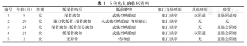 | 编号 | 年龄(月) | 性别 | 骶尾骨畸形 | 骶前肿物 | 肛门直肠畸形 | 其他畸形 | 瘘管 |