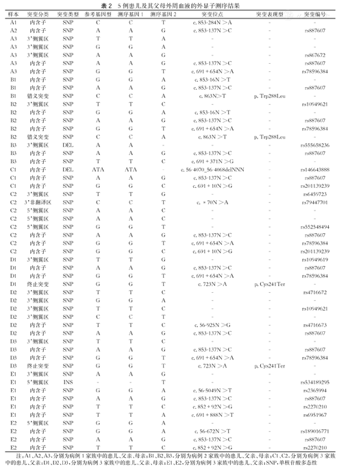 将5例患儿及其父母的外周血液进行了外显子测序,结果详见表2。