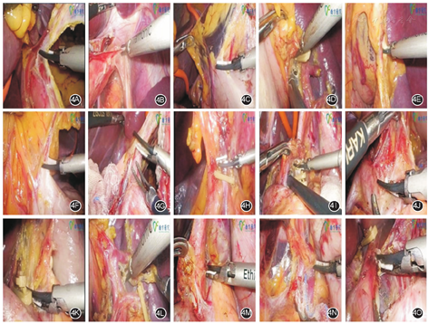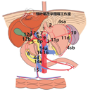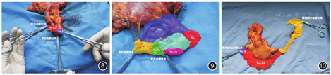 以下是本中心淋巴结挑检标准培训流程暨操作流程:(1)理论储备:成员先学习和熟悉胃周解剖,再由经验丰富的老师进行淋巴结分拣的理论授课讲解,让学员对胃的淋巴结分站和识别有系统和整体的认识,胃周淋巴结定位见图3。(2)识别和对应标本在体和离体状态:成员至手术室观摩和了解各种腹腔镜胃癌手术过程,观察手术医生如何分离各站淋巴结对应的组织、如何离段相应的血管,见图4,以便能够把离体标本和在体内时的状态对应起来,更加清晰地了解标本离体后各部分组织毗邻关系和血管夹等的来源。本中心在离断胃网膜左、胃网膜右、胃左、胃右动静脉等重要血管时,常规在标本侧予钛夹标记,从而能够更加精确地辨别各淋巴结分站。另外,在观看手术过程中,有时可看到手术医生单独分离和切除某些较为明显的肿大淋巴结,可提高学员对淋巴结形态和质感的鉴别能力。(3)离体标本淋巴结分拣:传统的胃癌离体标本的淋巴结检取方法,是直接在新鲜或甲醛固定的手术标本上取得淋巴结,该方法简单、低廉,易于推广,也是本中心目前最常用的检取淋巴结方法。为提高胃周淋巴结分站的准确性及检取数目,术者在离断胃周重要血管(胃网膜左、胃网膜右、胃左、胃右动静脉)时需要在标本侧予钛夹标记。标本离体后,利用解剖位置及钛夹定位胃周血管主干,然后按照第14版《日本胃癌处理公约》[15]依次将小弯侧与大弯侧的胃周组织进行分站处理。由于经过术者操作,离体标本跟实际胃周围组织的分布位置有误差,因此,各站别的归类也不是非常精准。