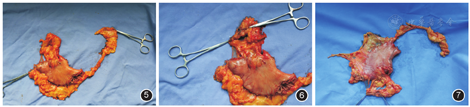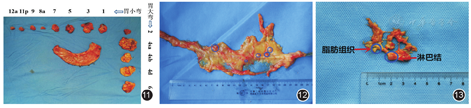 根据本中心术者的清扫习惯与处理标本的经验,以远端胃切除标本为例,总结分站方法供参考。具体如下:(1)标本袋贴标签、核对患者信息。(2)剪除大网膜后用清水简单清洗,再用毛巾擦拭。(3)将胃标本按体内原解剖位置摆放干净布单,测量大小弯长度并拍照,见图5。(4)淋巴结分站识别与分站,以远端胃为例:首先在小弯侧通过钛夹定位胃左动静脉、胃右动静脉,将它们向大弯侧牵拉,见图6和图7;结扎胃左动静脉钛夹的右上方至贲门右侧归为No.1,右下方归为No.11p,左上方钛夹附近组织归为No.9,左下方No.8a,结扎胃左动静脉钛夹与结扎胃右动静脉钛夹之间,稍微远离钛夹区域组织归为No.12a;结扎胃左动静脉钛夹至其第一个分支之间为No.7,结扎胃右动静脉钛夹至幽门上部分为No.5,靠近胃小弯侧的余下胃周组织归为No.3,见图8和图9;在胃大弯侧通过钛夹定位胃网膜左动静脉、胃网膜右动静脉。沿胃网膜左动静脉剪除组织归为No.4sb,沿胃网膜右动静脉剪除组织归为No.4d,幽门下区域组织归为No.6,见图10。由于胃大弯侧血管较明显,各站别比较容易区分,因此胃大弯侧淋巴结分站较小弯侧精准。如果是全胃切除的标本,在贲门小弯侧的胃周组织则归为No.1,在贲门大弯侧的胃周组织归为No.2,结扎胃网膜左动静脉钛夹上方的胃短血管周边组织归为No.4sa。全胃结构更完整,更容易识别,可通用远端胃方法。(5)各站淋巴结组织分离后的摆放与送检:按照固定的顺序摆放,再统一分袋送病理科检验,这样可以降低分拣过程中淋巴结站别错乱的概率。按大弯侧和小弯侧淋巴结两列分开摆放,每一列按站别数字大小顺序排列,见图11。检取之后仍然按该顺序摆放、分装并送检病理科。