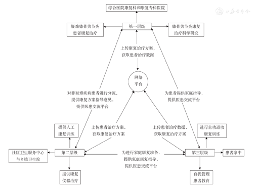 将综合医院康复科和康复专科医院作为KOA远程康复的第一层级,作用在于对疑难KOA患者进行康复治疗;对非疑难患者康复方案提供指导意见;对患者实施分流;进行KOA康复科学研究。
