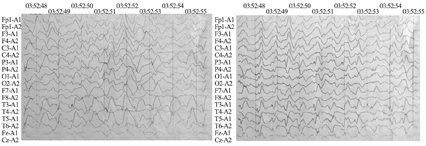 AHC合并癫痫的比例,国外文献报道在18.0%~87.5%[2,4],Panagiotakaki等[2]对157例AHC患者进行回顾性分析及随访,发现有53%的患者有癫痫发作,而国内李淑品等[4]研究的93例AHC患儿中,有14例合并癫痫,发病率为15.1%。AHC合并癫痫的发作类型有局限性发作、全面强直-阵挛发作、失神发作,以局限性发作为主(64.3%)且以一侧肢体阵挛发作常见,脑电图异常主要为背景活动减慢,发作间期表现为多灶性或广泛性棘波、棘慢波或弥散性慢波,部分患儿发作间期脑电图正常,发现78.6%的AHC合并癫痫患儿有癫痫持续状态病史,并推测AHC合并癫痫易出现危及生命的癫痫持续状态[4],在Panagiotakaki等[2]研究中发现AHC伴癫痫发作的类型多是局灶性发作或局灶性发作继发泛化,其中7例死亡的患者中有3例死于癫痫持续状态,提示应加强AHC合并癫痫患者的随访,重视并有效控制癫痫发作。本例患儿发作类型以全面性发作为主要表现,脑电图符合背景活动减慢表现,住院第2次脑电图可见少量尖慢波发放,病程中曾出现癫痫持续状态,因就诊及时,故未发生生命危险。
