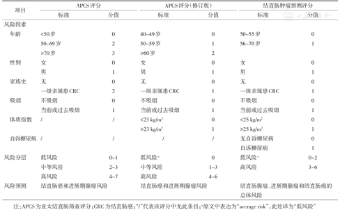 注:APCS为亚太结直肠筛查评分;CRC为结直肠癌;"/"代表该评分中无此条目;a原文中表达为"average risk",此处译为"低风险"