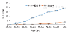 进一步分析危险因素与PSA水平异常以及前列腺癌发生的关系,3组人群之间年龄、降脂药物和前列腺炎病史等因素的分布差异有统计学意义(表2)。将这些危险因素进行多因素分析后发现,PSA水平异常与高龄和有前列腺炎病史等因素有关(表3),前列腺癌的发生与高龄、服用降脂药物有关(表4)。随着年龄的增高,PSA水平异常和前列腺癌发生率都逐渐升高(表5,图1)。