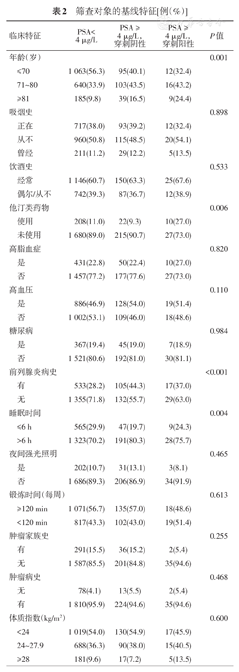| 临床特征 | PSA<4 μg/L | PSA ≥4 μg/L,穿刺阴性 | PSA ≥4 μg/L,穿刺阳性 | P值 | |