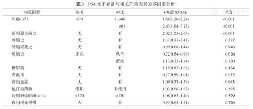 计数资料采用χ2检验。采用多元Logistic回归模型对可能的危险因素进行校正,计算比值比(OR)和95%可信区间(95%CI)来评估各种危险因素与PSA水平异常和前列腺发病风险的相关性。P<0.05为差异有统计学意义。所有统计分析使用SAS 9.1软件完成。
