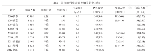 | 研究 | 筛查人数 | 筛查对象 | 年龄(岁) | PSA阈值(μg/L) | PSA异常[例(%)] | 穿刺人数[例(%)] | 确诊人数[例(%)] |