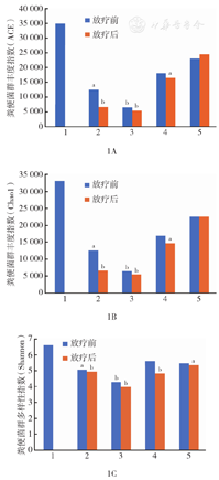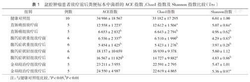 盆腔肿瘤患者放疗前后粪便标本中菌群的ACE指数、Chao1指数及Shannon指数比较(