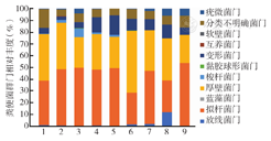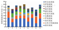 注:1为健康对照组;2为直肠癌组放疗前;3为直肠癌组放疗后;4为腹泻症状重组放疗前;5为腹泻症状重组放疗后;6为腹泻症状轻组放疗前;7为腹泻症状轻组放疗后;8为金双歧治疗组放疗前;9为金双歧治疗组放疗后