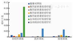 本研究所用金双歧中所含菌种属于双歧杆菌属、乳杆菌属和链球菌属,但与放疗前相比,金双歧组这3种菌属放疗后下降,而症状轻组这3种菌属放疗后上升(图4)。金双歧未对患者肠道菌群产生预期效果,可能原因是例数过少造成误差,或是患者放疗期间未足量服用金双歧。