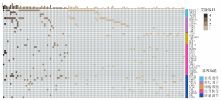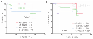 既往研究证实基因突变数目与预后相关,突变数目越多提示预后越差[2,7]。本组病例中携带≥3个克隆的患者PFS期显著缩短。由于本研究最长随访时间仅为36个月,且≥3个克隆的样本量较低(7例),尚待扩大样本量进一步验证。