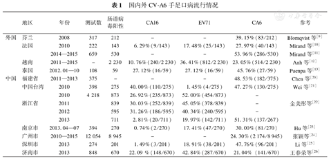 | 地区 | 年份 | 测试数 | 肠道病毒阳性 | CA16 | EV71 | CA6 | 参考 | |