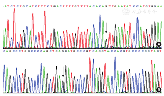 注:A示患者外周血标本检测到父源性致病突变IVS6-1 G>A;B示患者外周血标本检测到母源性突变c.1198 G>C