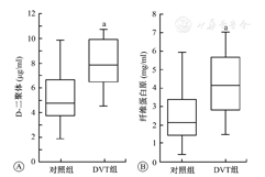 DVT组患者血浆中D-D和Fbg水平均明显高于对照组,差异有统计学意义(均P<0.01)。(表2、图1)
