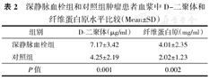 深静脉血栓组和对照组肿瘤患者血浆中D-二聚体和纤维蛋白原水平比较(Mean±SD)