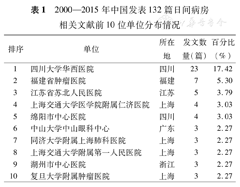 按单位发文数量排序,排在前10位的机构/单位发文情况见表1。以第一作者所在单位进行分析,132篇文献共来自国内70家机构或单位,其中发文最多的单位是四川大学华西医院,共发文23篇,占文献总量的17.42%;10家机构/单位共发表文献58篇,占文献总量的43.94%。