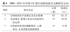 2016年1月4—8日,分别以"日间""日间病房""日间诊疗模式""日间化疗"为检索词,检索2000—2015年中国生物医学文献数据库(CBMdisc)、中国期刊全文数据库(CNKI)和维普中文科技期刊数据库(VIP)发表的文献,通过阅读摘要确定是否符合入选标准。文献纳入标准:所有与国内日间病房相关的论文。排除标准:与本研究无关、会议和消息类文献以及重复发表的文献。同一篇论文收录在不同数据库的只保留1篇。共筛选出132篇有效文献。