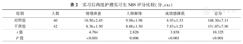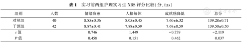 见表1,表2。表1显示,实习开始前,两组护理实习生职业倦怠感评分差异无统计学意义(P>0.05)。表2显示,实习结束后,对照组护理实习生职业倦怠感评分为(148.30±7.11)分,介于140.6~160.4分,属于轻度倦怠,高于干预组(P<0.05)。