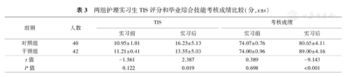 两组护理实习生TIS评分和毕业综合技能考核成绩比较(分,