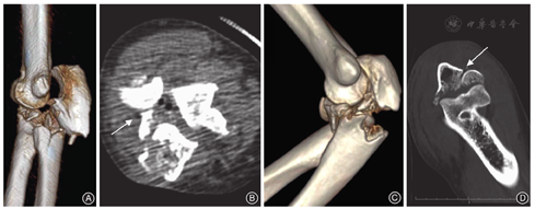 后孟氏骨折与经尺骨近端骨折后脱位不同点:①后孟氏骨折存在上尺桡关节脱位,包括上尺桡关节单纯脱位(尺骨桡切迹完整,无移位骨折,桡骨头自上尺桡关节内脱出,伴有环状韧带破裂,近端骨间膜损伤,图2A)及尺骨桡切迹破裂脱位(桡骨头自尺骨桡切迹脱出时,尺骨桡切迹粉碎骨块与桡骨共同移位,骨块嵌插于上尺桡间隙内,同时合并环状韧带破裂,近端骨间膜损伤,图2B);而经尺骨近端骨折后脱位上尺桡关节完整,包括无脱位(尺骨冠突骨折一般为前方骨折,骨折未累及尺骨桡切迹,上尺桡关系紧密,环状韧带完整,骨间膜完整,图2C)及桡骨头伴有完整上尺桡切迹移位(尺骨桡切迹骨折块完整,骨折块大,环状韧带完整,近端骨间膜损伤,图2D);②后孟氏骨折冠突多为粉碎;而经尺骨近端骨折后脱位,骨块多为完整。