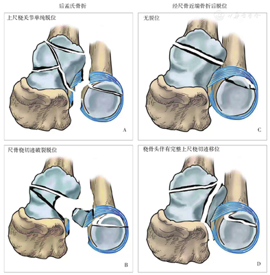 经典孟氏骨折的定义是尺骨骨折伴上尺桡关节脱位,如合并桡骨头后脱位,即肱桡关节后脱位时,称为后孟氏骨折。而对于不伴有上尺桡关节脱位者,不应笼统称为后孟氏骨折,可称为经尺骨近端骨折后脱位。对于伴有上尺桡关节脱位后孟氏骨折,临床相对少见,其冠突骨折通常粉碎,上尺桡关节遭到破坏,环状韧带及骨间膜损伤,治疗时在恢复骨性结构及处理外侧韧带复合体后,还须关注与处理上尺桡关节的稳定,预后疗效不确定。而经尺骨近端骨折后脱位临床相对多见,其冠突骨折块通常完整,环状韧带及骨间膜完好,在治疗上以恢复骨性结构为主,同时处理肘关节外侧韧带复合体,预后效果好。通过解剖基础、影像学特征、损伤特点、治疗方法及预后等方面鉴别和区分后孟氏骨折与经尺骨近端骨折后脱位。
