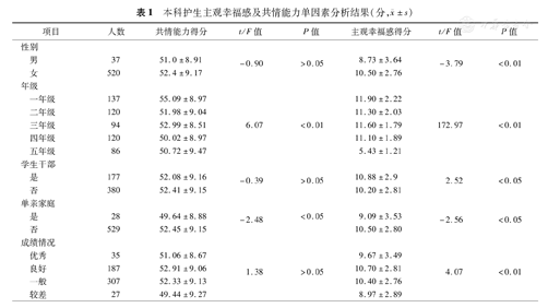 本科护生主观幸福感及共情能力单因素分析结果(分,